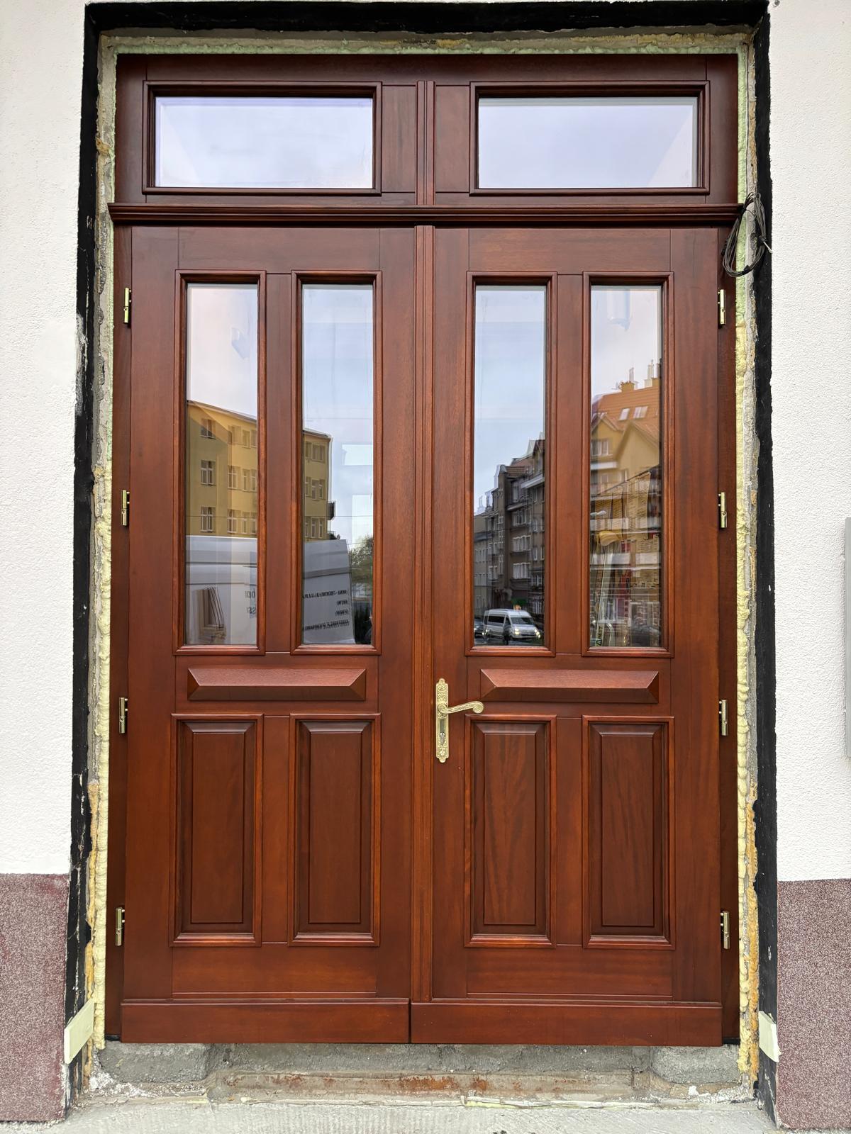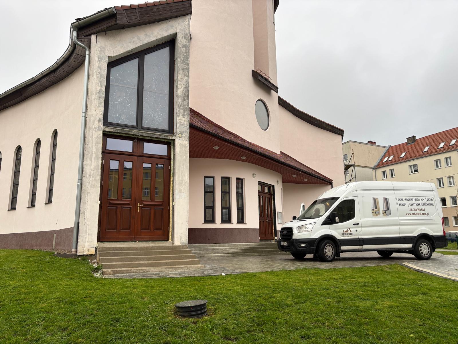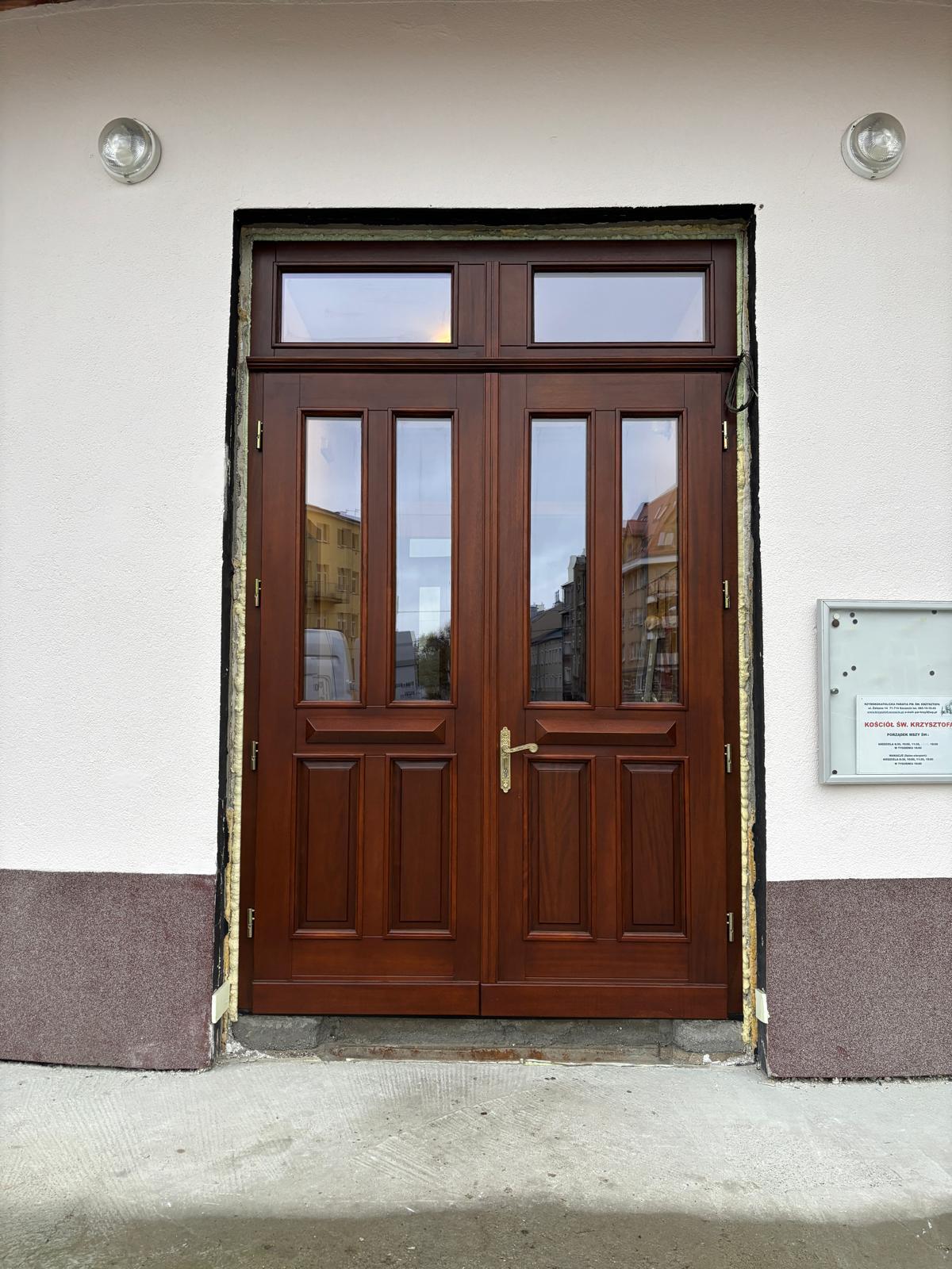 Drzwi wejściowe do kościoła w Szczecinie wykonane z drewna meranti w kolorze orzech afromozja.
